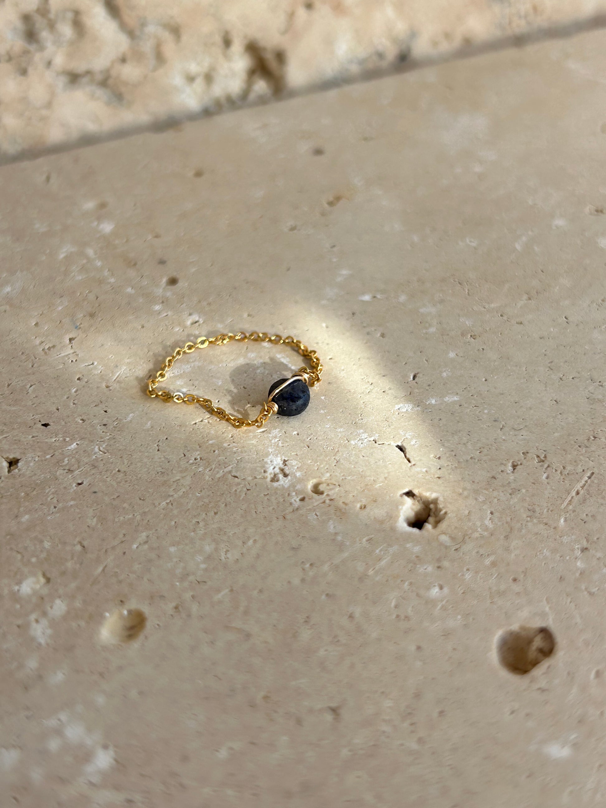 Une pierre naturelle est enlacée d'un fil d'or sur une fine chaîne, créant une pièce moderne et élégante.