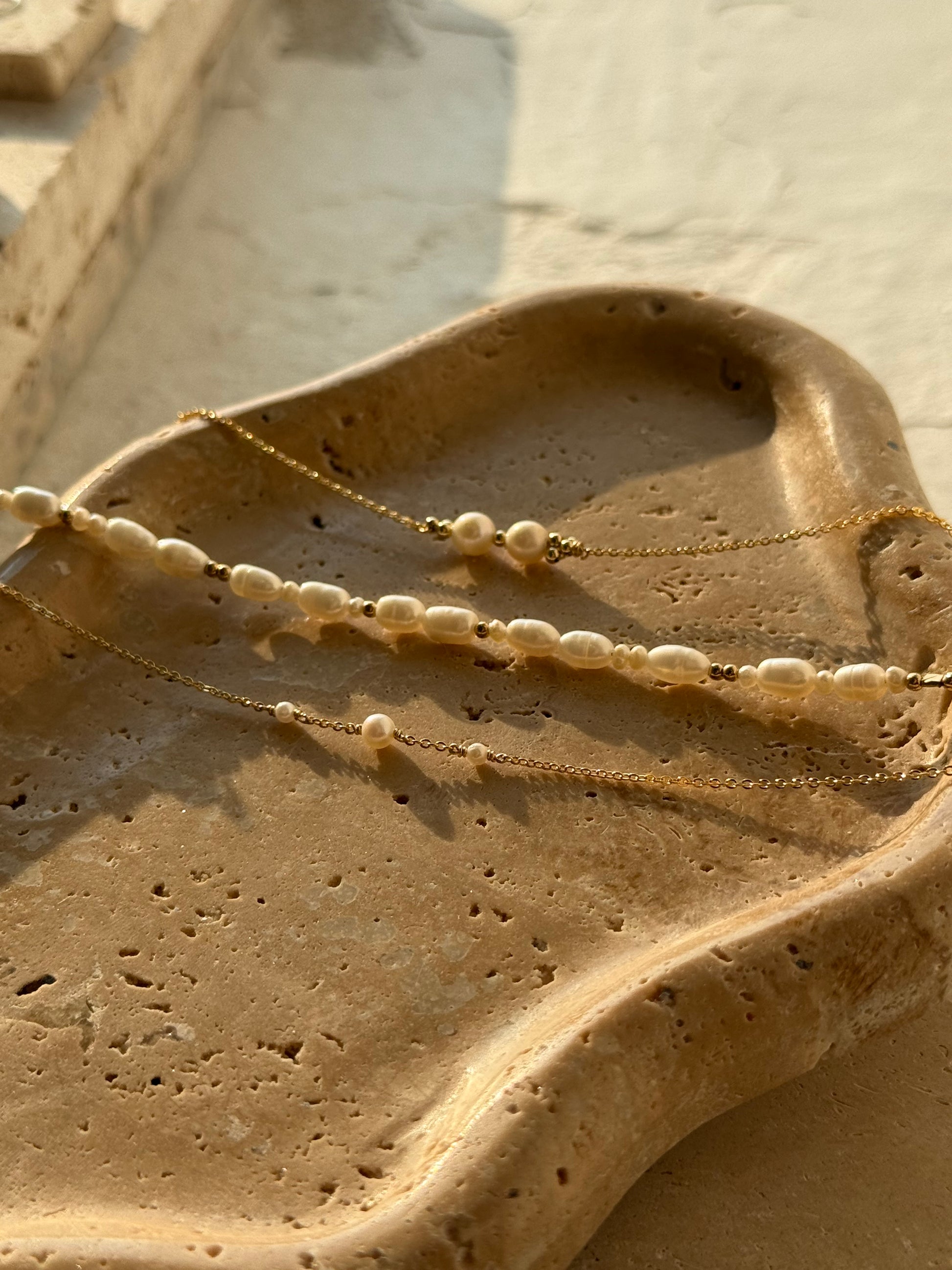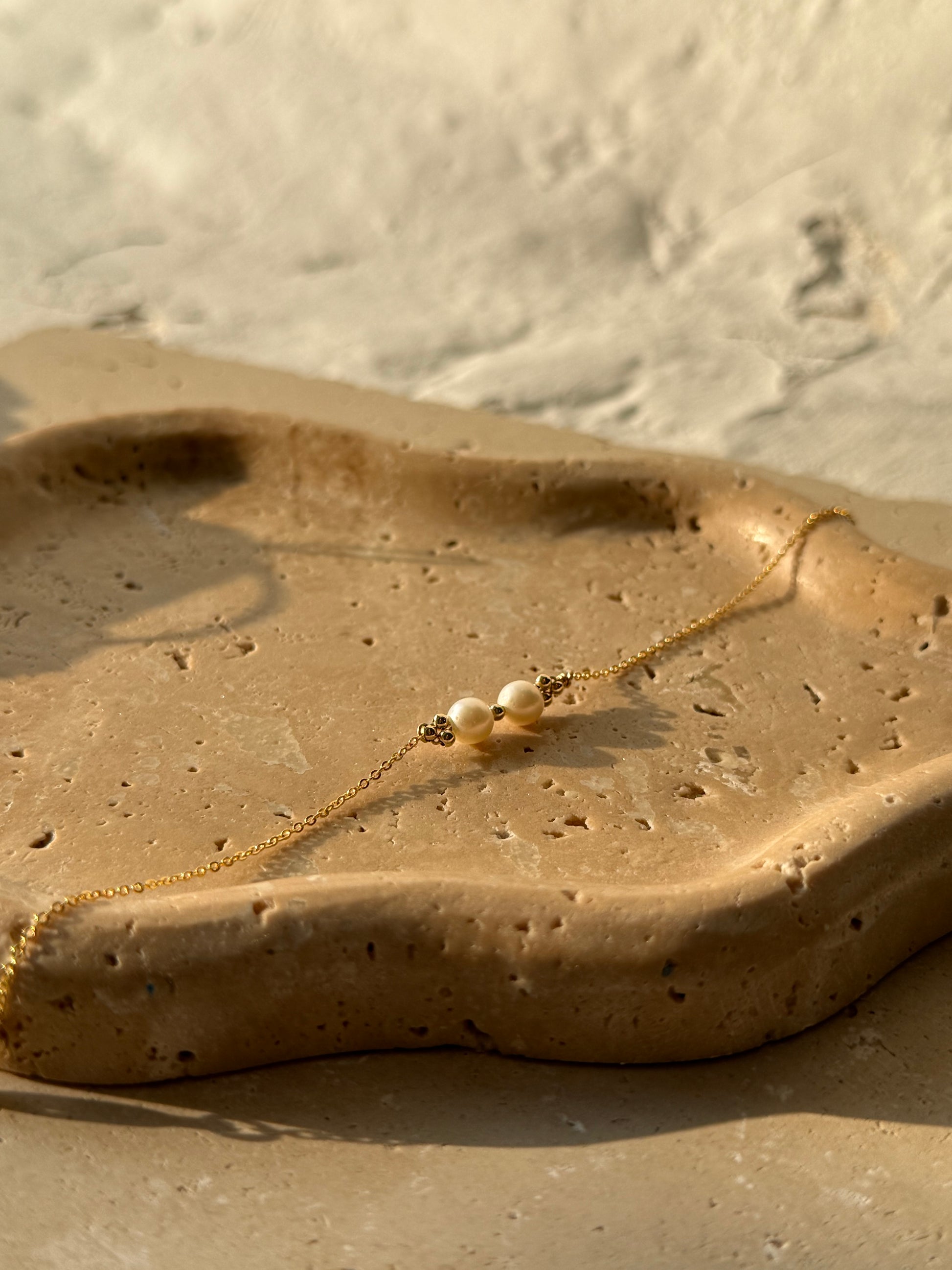 Délicat et symétrique, le bracelet Yara se compose d’une fine chaîne dorée ornée de deux perles de culture, et de part et d’autre, deux petites pampilles fixes, chacune formée de trois perles d’or.